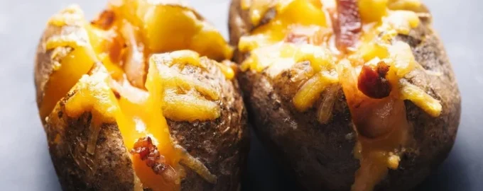 Cartofii copți sunt o gustare consistentă sau o mâncare caldă completă. Pentru a umple cartofii, folosiți piept de porc, ceapă și brânză. Aceste ingrediente au un gust grozav împreună. Serviți-i calzi cu un strop de ierburi deasupra.